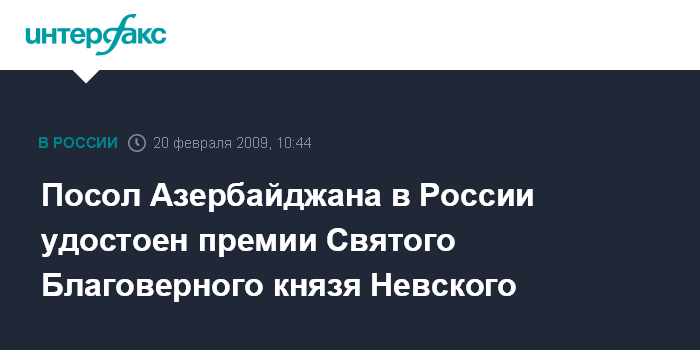 Москва. 20 февраля. INTERFAX.RU - Посол Азербайджана в России Полад Бюльбюльоглу удостоен премии Святого Благоверного князя Невского, сообщил азербайджанский телеканал ANS. Согласно сообщению, эту высокую награду Бюльбюльоглу получил в специальной номинации "За сохранение межнационального мира, согласия и укрепления дружбы между народами России и Азербайджана".