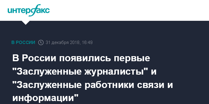 Москва. 31 декабря. INTERFAX.RU - Президент РФ Владимир Путин своим указом впервые присвоил звания "Заслуженный журналист РФ" и "Заслуженный работник связи и информации РФ".