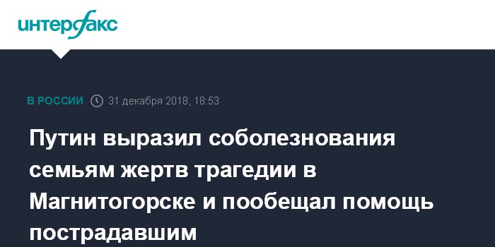 Москва. 31 декабря. INTERFAX.RU - Президент России Владимир Путин выразил соболезнования родным жертв обрушения подъезда в Магнитогорске и пообещал всю необходимую помощь пострадавшим в результате этой трагедии.
