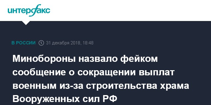 "Информация о якобы сокращении дополнительных выплат военнослужащим псковского гарнизона из-за якобы перечисления денежных средств на строительство главного храма ВС РФ в честь Победы в Великой Отечественной войне является не первым фейковым вбросом украинских пропагандистов", - сообщается в фейсбуке Минобороны.