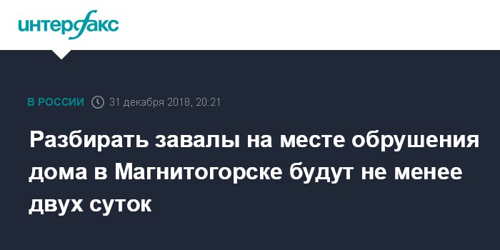 Москва. 31 декабря. INTERFAX.RU - Операция по разбору завалов обрушившегося в результате взрыва бытового газа подъезда жилого дома в Магнитогорске продлится не менее двух суток, сообщил журналистам глава МЧС Евгений Зиничев.