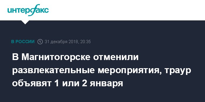Москва. 31 декабря. INTERFAX.RU - В Магнитогорске отменены все развлекательные мероприятия, кроме детских, как минимум до 1 января, в ближайшее время будет объявлен день траура, сообщили "Интерфаксу" в пресс-службе губернатора Челябинской области.