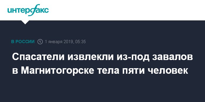 Москва. 1 января. INTERFAX.RU - Тела пяти человек извлечены из-под завалов на месте обрушения подъезда жилого дома в Магнитогорске, сообщили агентству "Интерфакс-Урал" в пресс-службе ГУ МЧС по Челябинской области.