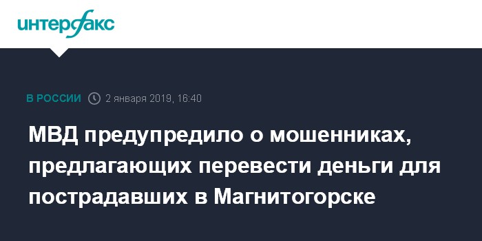 Москва. 2 января. INTERFAX.RU - Появилась информация о случаях мошенничества в интернете, когда неизвестные предлагают перевести деньги для пострадавших в результате обрушения подъезда жилого дома в Магнитогорске, на свои счета, сообщает пресс-служба ГУ МВД по Челябинской области.
