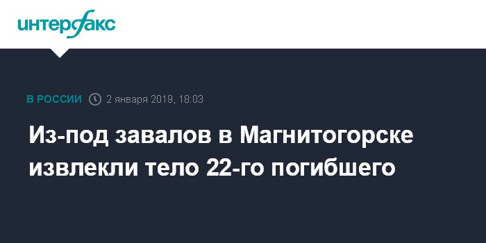 Москва. 2 января. INTERFAX.RU - Тело еще одного погибшего извлечено из-под завалов обрушившегося подъезда жилого дома в Магнитогорске, сообщили "Интерфаксу" в пресс-службе МЧС РФ.
