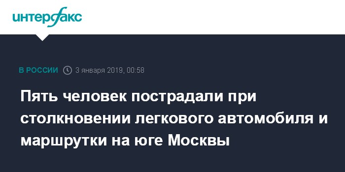 Москва. 3 января. INTERFAX.RU - Пять человек пострадали в результате столкновения легкового автомобиля и маршрутного такси на юге Москвы, сообщил "Интерфаксу" осведомлённый источник.