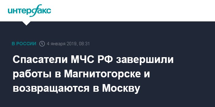 Москва. 4 января. INTERFAX.RU - Федеральное подразделение МЧС России завершило работы и отбыло с места обрушения жилого дома в Магнитогорске, передает корреспондент "Интерфакса" с церемонии построения личного состава.