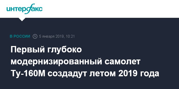 Москва. 5 января. INTERFAX.RU - Первый опытный образец глубоко модернизированного стратегического ракетоносца-бомбардировщика Ту-160М, как ожидается, будет готов летом 2019 года, сообщил "Интерфаксу" источник в авиационной отрасли.