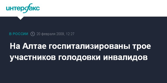 Москва. 20 февраля. INTERFAX.RU - Пятеро инвалидов две недели продолжают голодовку, требуя разрешить им приватизировать их квартиры в специализированном доме для инвалидов-колясочников в Рубцовске (Алтайский край). Трое участников голодовки, у которых ухудшилось состояние здоровья, госпитализированы, сообщили агентству "Интерфакс-Сибирь" в мэрии Рубцовска.