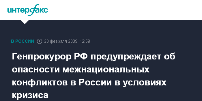 Москва. 20 февраля. INTERFAX.RU - Генпрокурор РФ Юрий Чайка считает, что на фоне мирового финансово-экономического кризиса в России возможен рост социальной напряженности, что может привести к межнациональным и межрелигиозным конфликтам.
