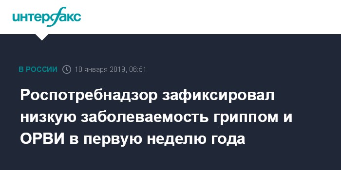 Москва. 10 января. INTERFAX.RU - Низкая заболеваемость гриппом и ОРВИ наблюдалась в России в первую неделю 2019 года, сообщил Роспотребнадзор.