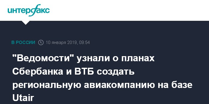 Москва. 10 января. INTERFAX.RU - Региональная авиакомпания, проект которой по поручению правительства прорабатывают Сбербанк и ВТБ , может быть создана на базе Utair, пишет газета "Ведомости" в четверг.