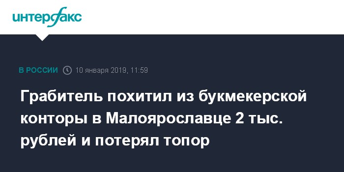 Москва. 10 января. INTERFAX.RU - Чуть больше двух тысяч рублей смог похитить грабитель-неудачник, напавший в маске и с топором на букмекерскую контору в Малоярославце (Калужская область), сообщила пресс-служба областного управления МВД.