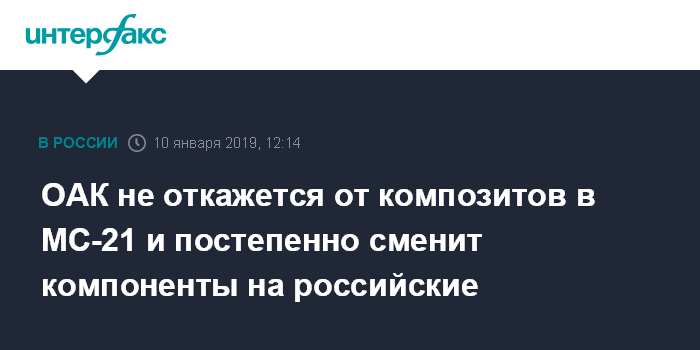 Москва. 10 января. INTERFAX.RU - Объединенная авиастроительная корпорация (ОАК) не планирует отказываться от использования композитных материалов в производстве самолета МС-21 из-за того, что компания "Аэрокомпозит" была внесена в санкционные списки США.