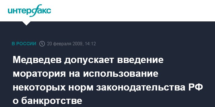 Москва. 20 февраля. INTERFAX.RU - Президент РФ Дмитрий Медведев поручил правительству проработать вопрос о возможности приостановки действия некоторых норм законодательства о банкротстве.