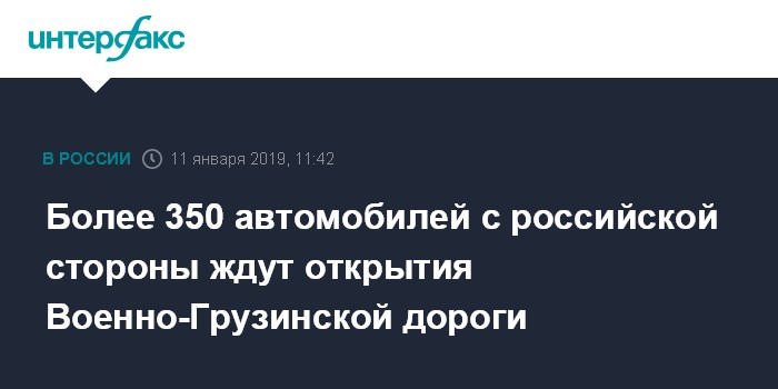 Москва. 11 января. INTERFAX.RU - Более 350 автомобилей ожидают открытия Военно-Грузинской дороги на выезде из РФ, движение на трассе запрещено уже четвертый день из-за непогоды в Грузии, сообщает в пятницу пресс-служба ГУ МЧС Северной Осетии.