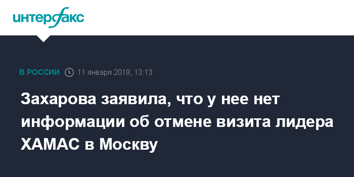 Москва. 11 января. INTERFAX.RU - Официальный представитель МИД РФ Мария Захарова заявила, что не располагает информацией о том, что визит лидера ХАМАС Исмаила Хании в Москву, запланированный на 15 января, не состоится.