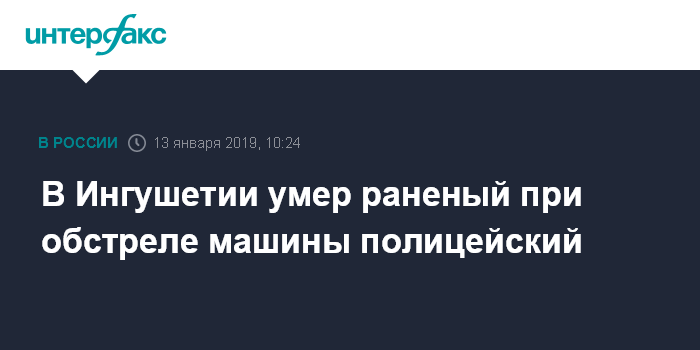 Москва. 13 января. INTERFAX.RU - В реанимации ингушской республиканской больницы от полученных ран скончался сотрудник правоохранительных органов, пострадавший при обстреле накануне вечером, сообщили в воскресенье "Интерфаксу" в медучреждении.