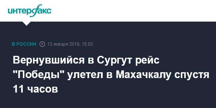 Москва. 13 января. INTERFAX.RU - Пассажиры вернувшегося по техническим причинам рейса "Сургут - Махачкала" авиакомпании "Победа" вылетели в Махачкалу, сообщили "Интерфаксу" в справочной сургутского аэропорта.