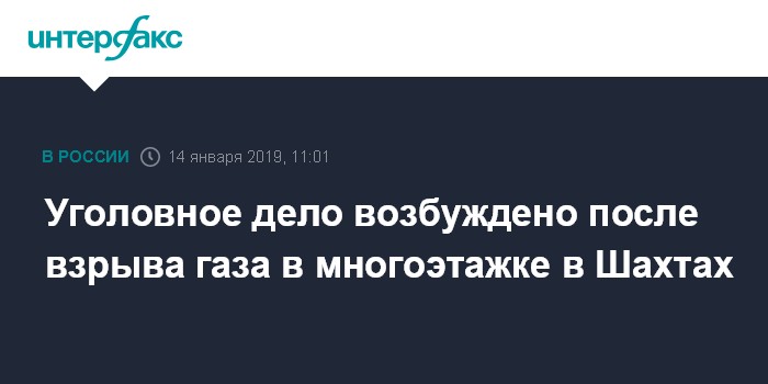 Москва. 14 января. INTERFAX.RU - Уголовное дело возбуждено после взрыва газа в многоэтажном жилом доме в городе Шахты Ростовской области, в результате которого погиб один человек, сообщил представитель следственного управления СК РФ по Ростовской области на заседании оперативного штаба в понедельник.
