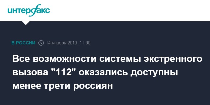 Москва. 14 января. INTERFAX.RU - Счетная палата по итогам проверки соответствующей федеральной целевой программы (ФЦП) пришла к выводу, что всеми возможностями системы вызова экстренных служб "112" могут воспользоваться менее 30% россиян.