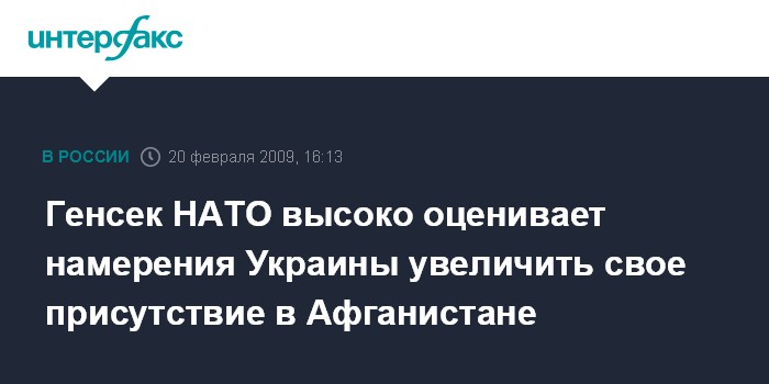 Москва. 20 февраля. INTERFAX.RU - Генеральный секретарь НАТО Яап де Хооп Схеффер высоко оценивает намерения Украины увеличить свое присутствие в Афганистане. Об этом генсек альянса заявил в пятницу в Кракове на итоговой пресс-конференции, которая состоялась по окончании неформального заседания министров обороны стран НАТО, в рамках которого также прошло и заседание комиссии Украина-НАТО.