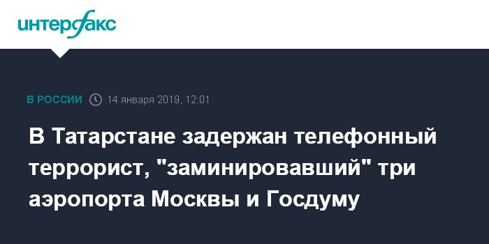 В Татарстане задержан телефонный террорист, "заминировавший" три аэропорта Москвы и Госдуму
