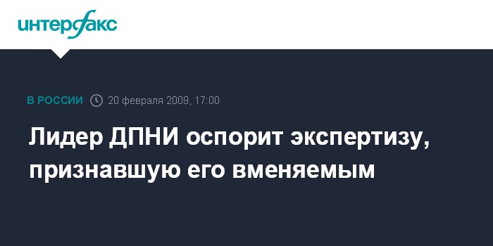 Москва. 20 февраля. INTERFAX.RU - Назначенная судом медицинская экспертиза здоровья лидера Движения против нелегальной иммиграции (ДПНИ) Александра Белова признала его вменяемым, лидер ДПНИ намерен оспорить процедуру экспертизы.