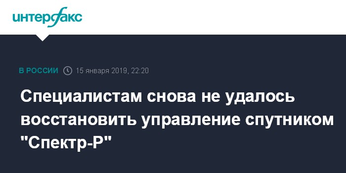 Москва. 15 января. INTERFAX.RU - Очередной сеанс связи со спутником "Спектр-Р" завершен во вторник, космический аппарат (КА) не передал ответный сигнал по командной линии, заявил "Интерфаксу" советник главы Роскосмоса по науке Александр Блошенко.