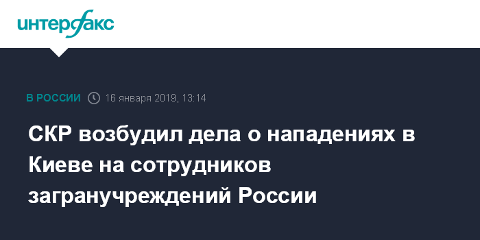 Москва. 16 января. INTERFAX.RU - Следственный комитет РФ (СКР) возбудил уголовные дела после нападения в Киеве в 2018 году неизвестных лиц на сотрудников российских загранучреждений на Украине, сообщила официальный представитель Следственного комитета (СК) Светлана Петренко.