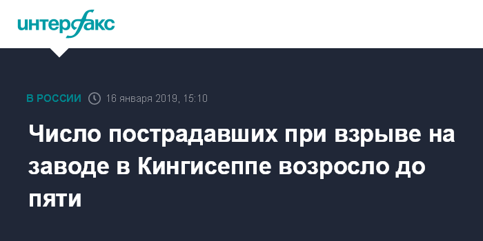 Москва. 16 января. INTERFAX.RU - Пять человек пострадали при взрыве на заводе ООО "Полипласт С-З" в Кингисеппе (Ленинградская область), сообщила журналистам в среду главный врач Кингисеппской межрайонной больницы им. Прохорова Зинаида Корончевская.