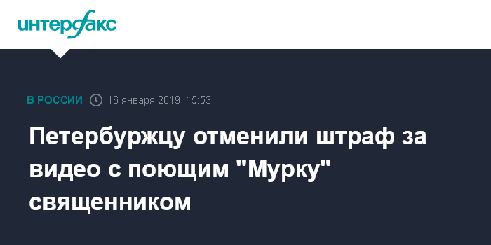 Москва. 16 января. INTERFAX.RU - Суд в Санкт-Петербурге отменил штраф в 300 тыс. рублей, назначенный петербуржцу за публикацию во "ВКонтакте" видео со священником, поющим "Мурку", в которой суд первой инстанции усмотрел признаки экстремизма.
