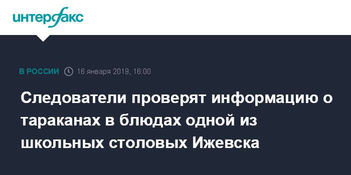 Москва. 16 января. INTERFAX.RU - Специалисты СУ СКР по Удмуртии начали проверку информации об антисанитарии в столовой школы №56 в Ижевске, сообщает пресс-служба управления в среду.