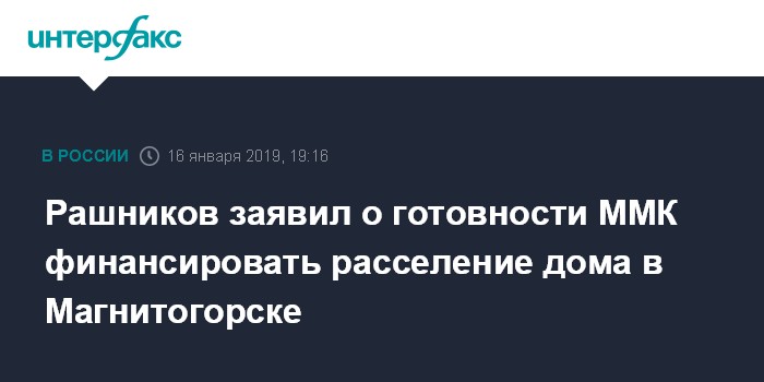 Москва. 16 января. INTERFAX.RU - Основной акционер и председатель совета директоров Магнитогорского комбината Виктор Рашников заявил о готовности предприятия участвовать в финансировании расселения поврежденного взрывом газа дома.