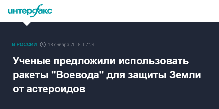 Москва. 18 января. INTERFAX.RU - Применять межконтинентальные баллистические ракеты РС-20 "Воевода" на первых этапах создания системы планетарной защиты "Цитадель-1" предлагают ученые.