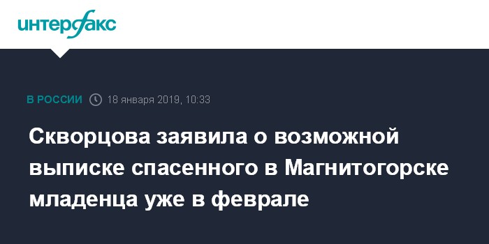 Москва. 18 января. INTERFAX.RU - Пострадавшего в Магнитогорске ребенка могут выписать из московского НИИ неотложной детской хирургии и травматологии в феврале, сообщила министр здравоохранения РФ Вероника Скворцова.