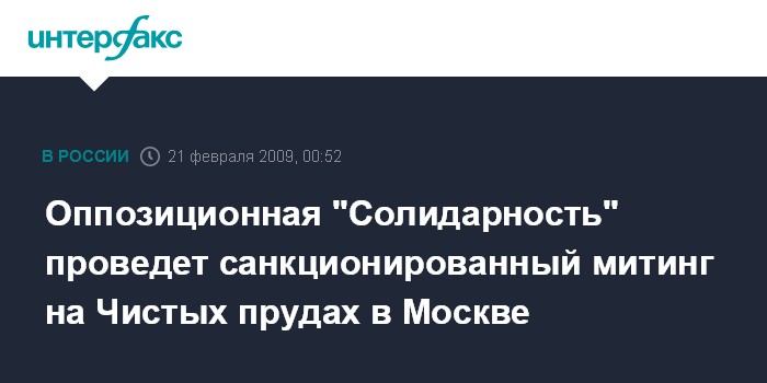 Москва. 21 февраля. ИНТЕРФАКС - Оппозиционное движение "Солидарность" проведет в субботу около памятника Грибоедова в Москве митинг, разрешенный властями Москвы, в котором также примет участие экс-премьер России, лидер Российского народно-демократического союза (РНДС) Михаил Касьянов.