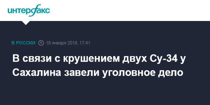 Москва. 18 января. INTERFAX.RU - Военные следователи возбудили уголовное дело о нарушении правил полетов и подготовки к ним после столкновения самолетов Су-34 в районе Татарского пролива, сообщили журналистам в пресс-службе Главного военного следственного управления СК РФ.