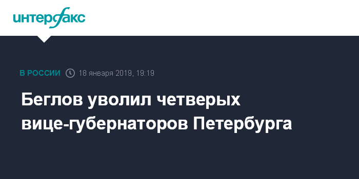 Москва. 18 января. INTERFAX.RU - Временно исполняющий обязанности губернатора Санкт-Петербурга Александр Беглов освободил от государственной должности четверых вице-губернаторов, сообщение служба Смольного в пятницу.