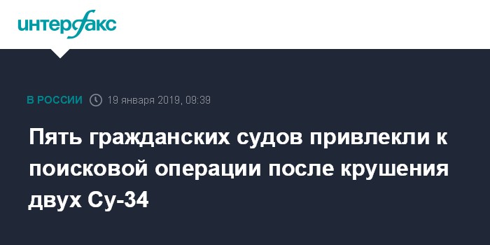 Москва. 19 января. INTERFAX.RU - Пять гражданских судов, в том числе четыре рыболовецких, работают в районе столкновения двух бомбардировщиков Су-34 над Японским морем, сообщили "Интерфаксу" в приморском филиале морского спасательно-координационного центра.