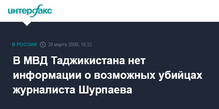 Душанбе. 28 марта. INTERFAX.RU - Министерство внутренних дел Таджикистана не располагает сведениями о том, что подозреваемые в убийстве российского журналиста Ильяса Шурпаева находятся на территории этой страны, однако готово оказать содействие своим коллегам из России, сообщил журналистам в пятницу начальник штаба МВД республики Хайдар Махмадиев.