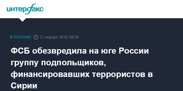 Москва. 21 января. INTERFAX.RU - Сотрудники Федеральной службы безопасности (ФСБ) обезвредили на юге России управляемую из Сирии группу, финансировавшую террористическую организацию ИГ (запрещена в РФ), сообщили в Центре общественных связей (ЦОС) ведомства.