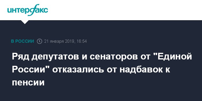 Москва. 21 января. INTERFAX.RU - Депутаты и сенаторы, в том числе входящие в руководство партии "Единая Россия", подали безотзывные заявления в Минтруд об отказе от депутатских и сенаторских надбавок к пенсии, сообщает пресс-служба партии в понедельник.