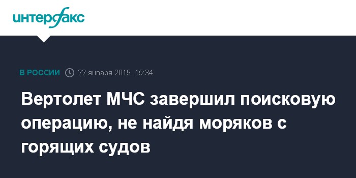 Москва. 22 января. INTERFAX.RU - Вертолет МЧС завершил поисково-спасательную операцию (ПСО) в районе возгорания двух судов в Черном море, сообщается на сайте спасательно-координационного центра (СКЦ) Росморречфлота.