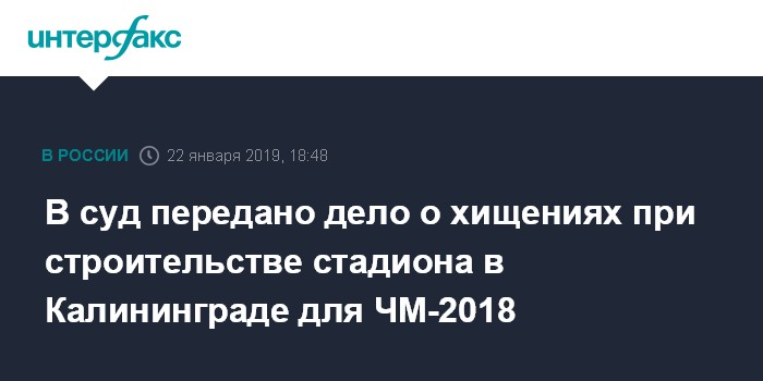 Москва. 22 января. INTERFAX.RU - Направлено в суд уголовное дело о хищении 752 млн рублей, выделенных на подготовку стадиона Чемпионата мира ФИФА в Калининграде, сообщили "Интерфаксу" в пресс-службе Генпрокуратуры РФ.