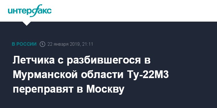 Москва. 22 января. INTERFAX.RU - Летчика с разбившегося в Мурманской области Ту-22М3 доставят на лечение в Москву, заявили в Минобороны РФ.