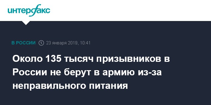 Москва. 23 января. INTERFAX.RU - Около 135 тысяч призывников освобождаются от военной службы из-за проблем с нарушением питания, заявила в среду глава Роспотребнадзора Анна Попова.
