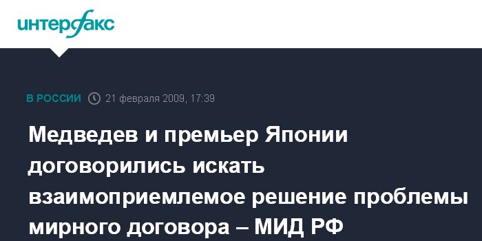 Москва. 21 февраля. INTERFAX.RU - В ходе состоявшейся 18 февраля в Южно-Сахалинске встречи между президентом РФ Дмитрием Медведевым и премьер-министром Японии Трао Ассо состоялся обмен мнениями по проблеме мирного договора, включая аспект пограничного размежевания, сообщает в субботу МИД РФ.