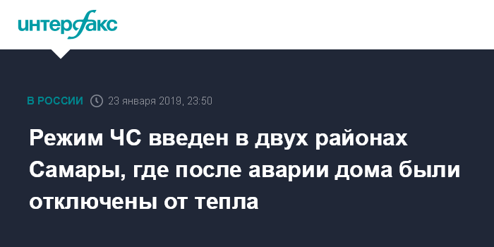 Москва. 23 января. INTERFAX.RU - Режим чрезвычайной ситуации введен в двух спальных районах Самары, где в результате аварии на теплотрассе остаются без тепла несколько сотен домов, сообщил начальник Главного управления МЧС РФ по Самарской области Олег Бойко журналистам на брифинге в областном центре.