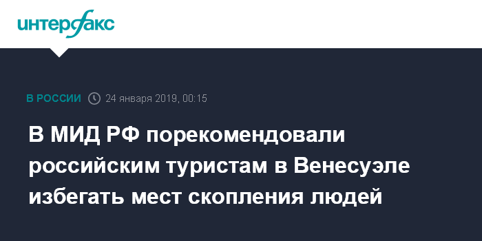 Москва. 24 января. INTERFAX.RU - Россиянам, находящимся в Венесуэле, следует быть осторожнее и избегать мест массового скопления людей, так как демонстрации в этой стране привели к столкновениям, в которых уже есть погибшие, сообщает в ночь на четверг ситуационно-кризисный центр (ДСКЦ) МИД РФ.